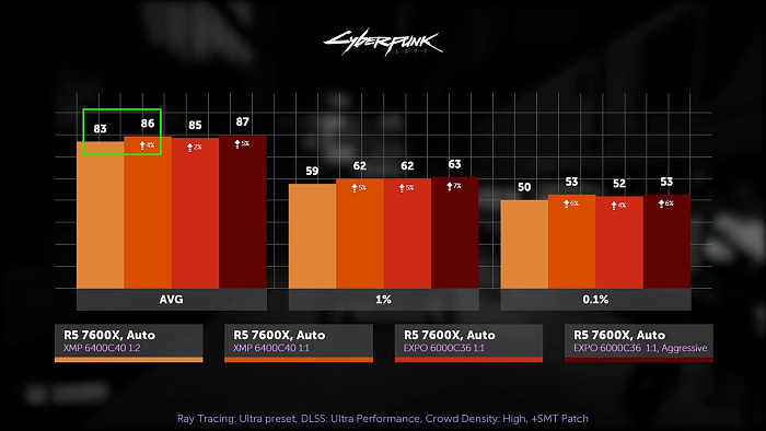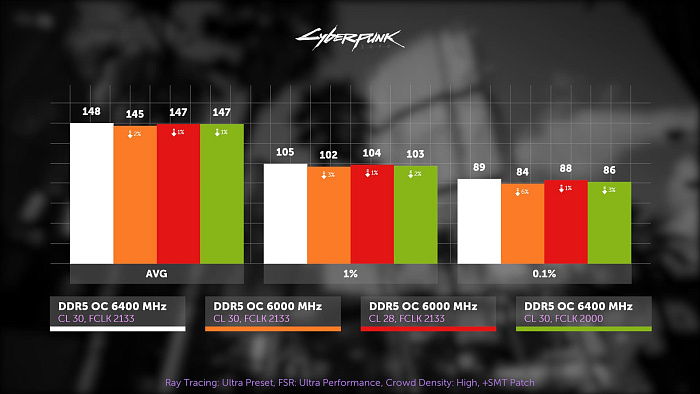 Киберпанк, пресет: трассировка лучей ультра, FSR: ультра производительность, плотность толпы высокая. Заранее предупреждаем, что игры выбирались на основе повторяемости среднего значения FPS, ибо всякие Лары Крофт склонны к рандому, но статистика очень редких событий здесь имеет высокую погрешность, особенно в киберпанке, поэтому на неё лучше не смотреть. Итак, в весьма требовательной к памяти игре потеря от снижения частоты памяти на 400 МГц настолько невелика, что беспокоиться о ней нет смысла, к тому же более низкие тайминги позволяют сократить разницу до одного процента. Столько же даёт разгон фабрики.