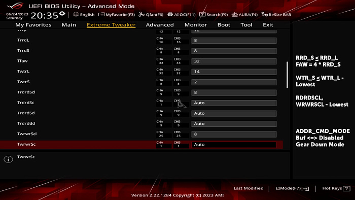 Переходим к третьей четвёрке игроков. С RRD и FAW всё просто: оба RRD ставьте равными 8, а FAW должен быть в 4 раза больше RRD_s, то бишь 32. WTR_s, WTR_l имеют классический закон: меньше - лучше, но как и с RRD, тот, что с окончанием _l не должен быть меньше того, что с _s на конце. RDRD-/WRWRSCL 8/8 не являются предельным разгоном в нашем случае, но более низкие значения прироста уже не дают.