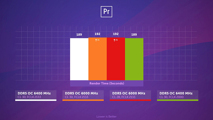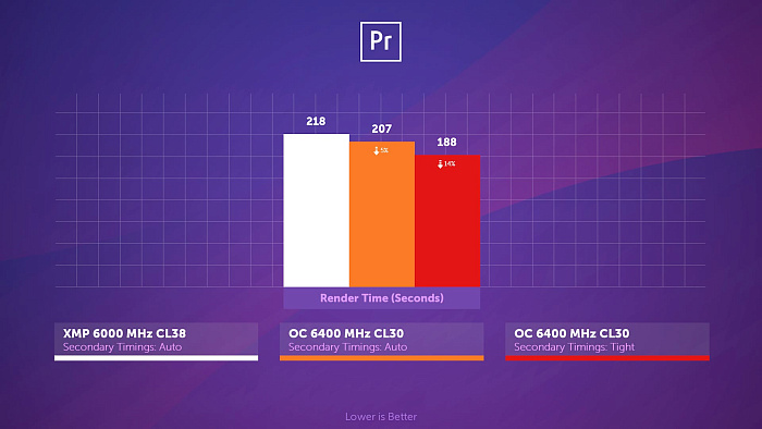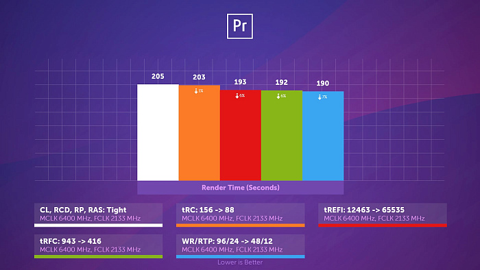 В более реальном Adobe Premiere Pro пропускная способность памяти тоже немаловажна, но, видимо, только записи, ведь уменьшение частоты Infinity Fabric, влияющее на чтение и копирование, здесь никак не сказалось.