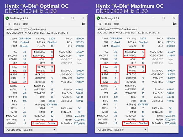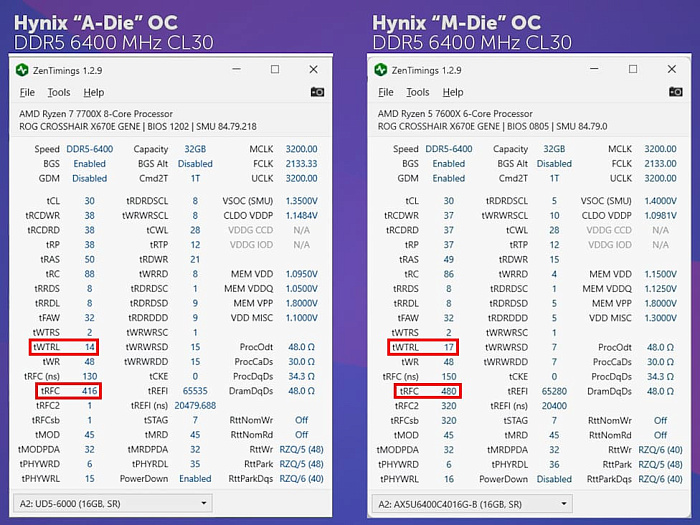 Теперь, когда мы знаем, какие тайминги важны, давайте ответим на вопрос, какие чипы лучше всего подходят для 7000 ryzen'ов. И ответ вас не удивит: это - Hynix “A-Die”. Если опираться на наш разгон Hynix “M-Die”, то можно узнать, что мы были довольно безбашенными, подавая на SoC 1.4 В, а также, что у M-Die хуже tRFC и WTR_L. Вспоминая результативность этих таймингов, можно прийти к заключению, что разница будет едва заметна.