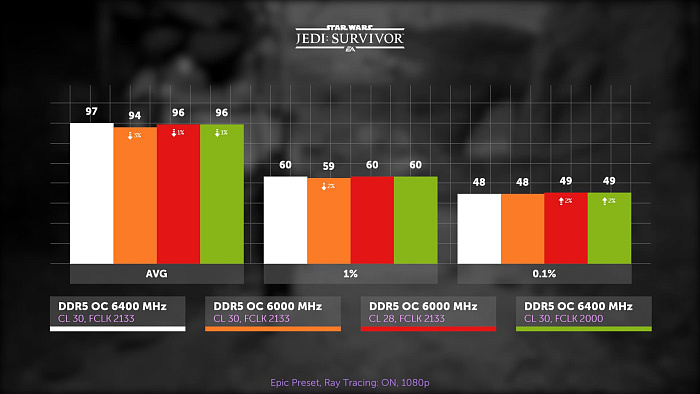 Star Wars Jedi: Survivor, эпический пресет с трассировкой, 1080р. Ничего нового не обнаружилось. Снижение частоты забрало 3% вместо двух, но соответствующие ей тайминги вновь сократили отставание до 1%, как и сброшенная Infinity Fabric.