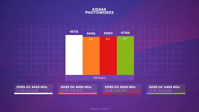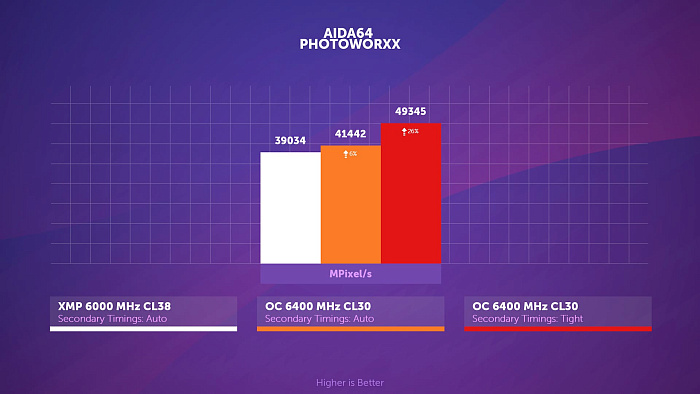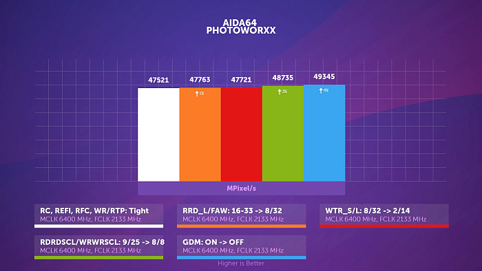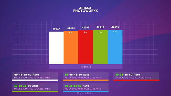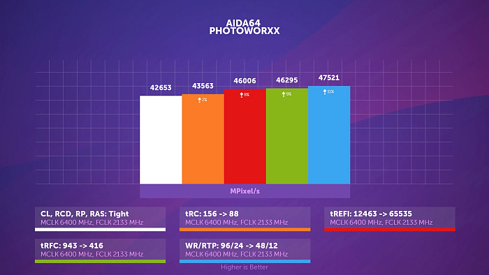 В другом подтесте аиды, PhotoWorxx, как частота памяти, так и infinity fabric оказывает куда более значимое влияние на результат, нежели тайминги, возвращающие лишь один процент из пяти потерянных.