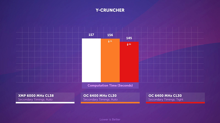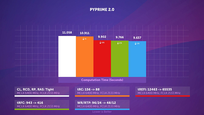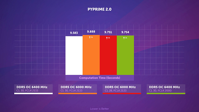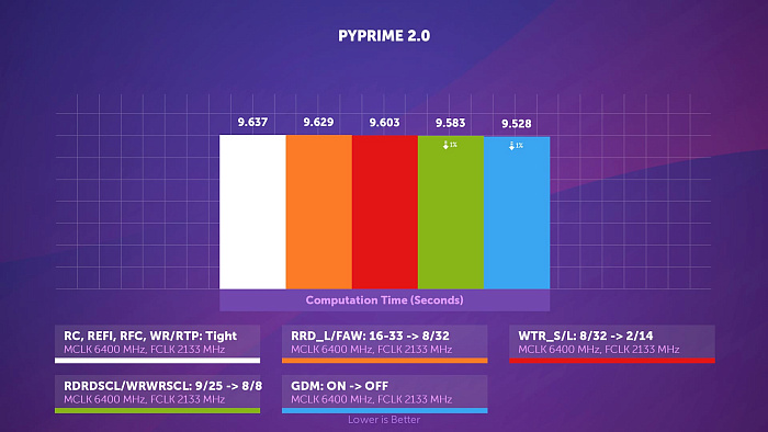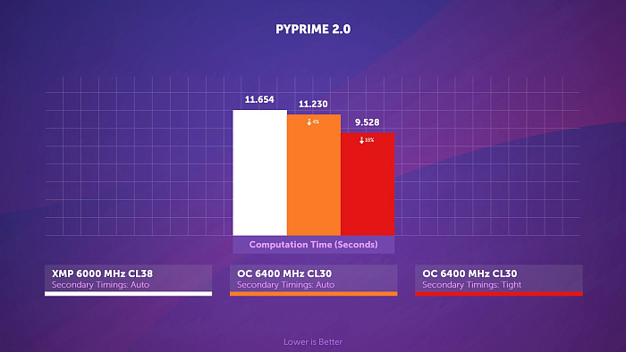 В PYPrime 2.0 снижение частоты памяти на 400 МГц приводит к 3% замедлению в вычислениях, а с поджатыми таймингами результат всё равно на 2% хуже, несмотря на священные для многих 6000 МГц.