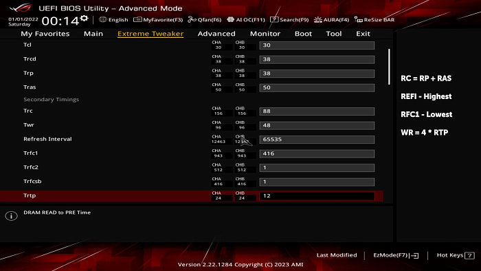 RFC тоже привязывают к необязательному правилу: он должен быть кратен 32, RFC2 и RFCsb на 7000 ryzen'ах не учитываются, можно единички поставить. От себя добавим интересный факт: повышение RFC с 400 до 416 позволило снизить напряжение VDD с 1.47 В до 1.39 В. Так что сильно пережимать не стоит. WR и RTP связаны четырёхкратным соотношением. И так как значение первого не может быть ниже 48, то второй ставим равным 12 и забываем. Нужно ещё поискать модули памяти, которые на этих значениях будут нестабильны.