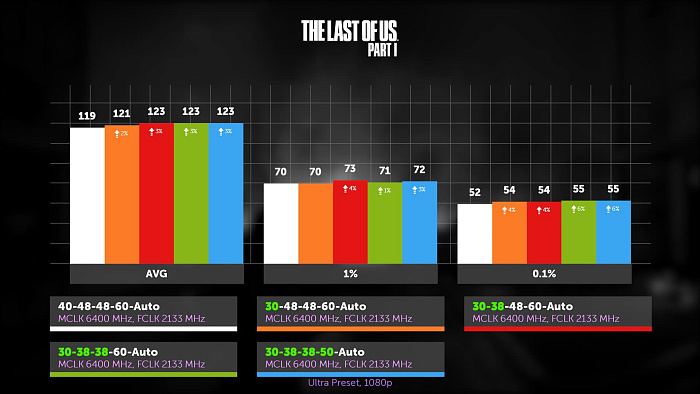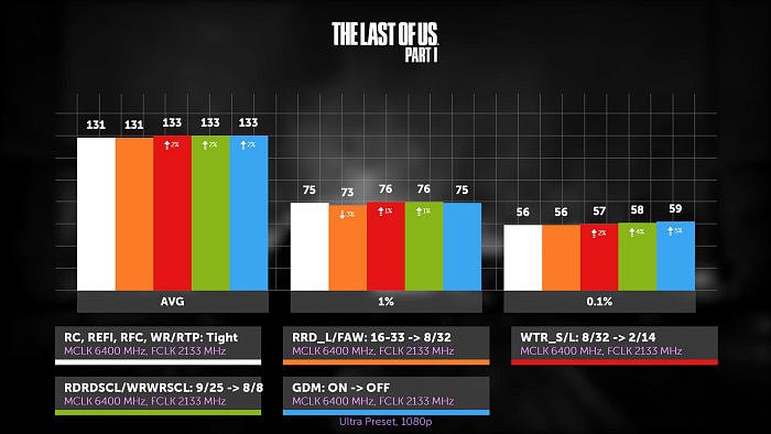 The Last of US вновь хуже отреагировала на настройку таймингов. Оно и неудивительно: трассировки здесь нет, да и игра по сути своей не новая, вот и данных гоняется меньше.