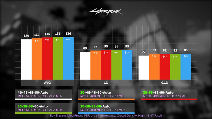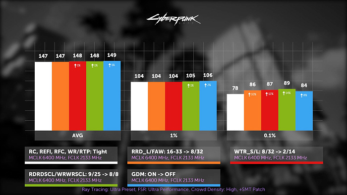 В киберпанке WTR и отключение GDM дали по одному кадру, но вот что иронично. После всех этих разгонов мы обнаружили, что цепочка экспериментов привела к тому, что мы посчитали, что первичные тайминги, равные 38, максимально ужаты, но нет. Ранее упомянутое повышение RFC, позволившее снизить напряжение на память, косвенно дало доступ к стабильным RC, RP со значением на единицу ниже, но отключение GDM вновь запретило ужимать их ниже 38. Так что по факту от шевеления GDM вообще толку нет, т.к. повышение первичек из-за него сводит прирост на нет.