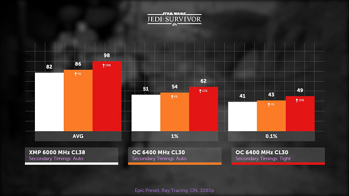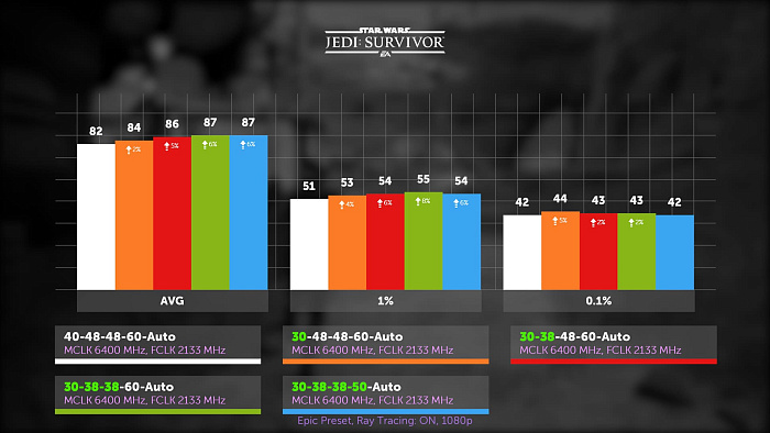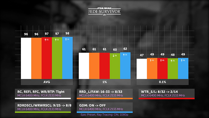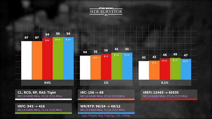 Выживший джедай, в свою очередь, остро отреагировал на пару REFI и RFC, только два этих тайминга обеспечили 10% прирост в этой игре. А если окунуться в омут памяти, то можно вспомнить, что на старте AM5 REFI был недоступен на большинстве материнских плат, и только потом его уже добавили.