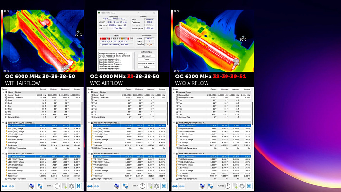 И раз уж заговорили про напряжения, поговорим об остальных. Здесь попроще, чем на intel ввиду низких частот. Как правило, помимо SoC нужно подобрать VDD и VDDQ. Оба этих напряжения относятся именно к модулям и влияют на нагрев. Для финального разгона нам потребовалось только 1.39 и 1.3 В для VDD и VDDQ соответственно, что считается скромным напряжением по меркам оверклокеров, но это с вентилятором над памятью. Что будет без него?