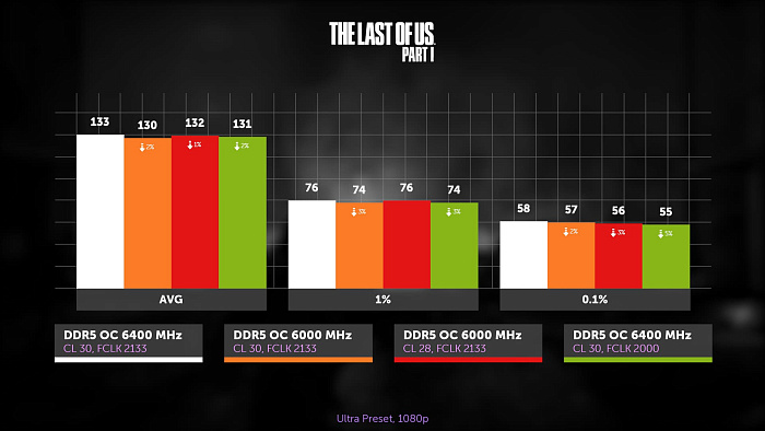 Одни из нас: часть первая. Ультра пресет, 1080р. Разница та же. И если вспомнить, что для 6400 МГц нам потребовалось подать 1.35 В на SoC, в то время как 6000 МГц требуют всего 1.05 В, риск явно не оправдан. О промежуточных 6200 МГц тоже не забываем.