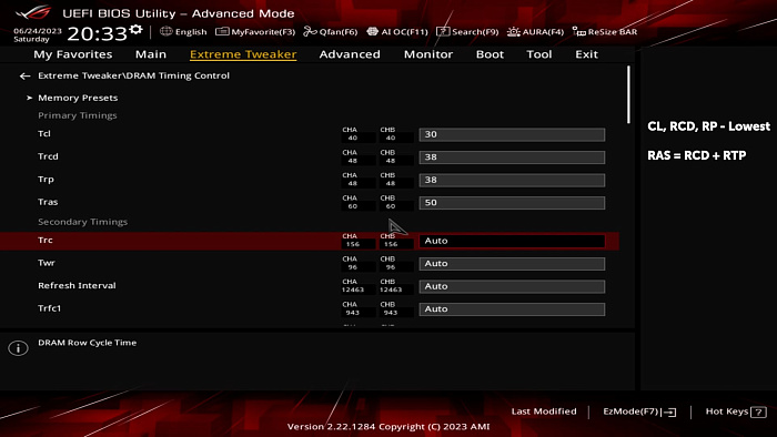 Переходим к следующему этапу: тайминги. Если попробовать их посчитать, то можно ужаснуться от предстоящей работы, но уверяем вас, к концу гайда вы убедитесь, что действительно надо настраивать не так и много. Начнём с первичек. Точкой отсчёта послужит разгон всех частот с выставленными с запасом первичными таймингами. По счастливой случайности все из них них завышены на 10 единиц, поэтому будет удобно оценить, насколько тот или иной полезен. Что касаемо формул, их нет. На форумах можно встретить оную для последнего тайминга RAS, равному сумме RTP и RCD, но по факту она нужна больше для удобства, а не извлечению наибольшей производительности. Сейчас убедитесь.
