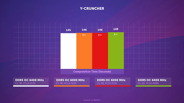 Скорость вычисления числа Pi в бенчмарке Y-Cruncher практически не зависит от частоты памяти, зато фабрика в этой задаче важна.