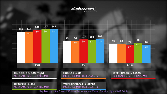 В этот раз не оказавшей никакого влияния в играх стала связка WR/RTP, поэтому они будут только столбиком. Остальные же тайминги не изменяют свою значимость. В киберпанке сокращение RC почти в 2 раза дало всего 1 FPS, максимальный REFI ещё 6%, а RFC чуть больше процента.
