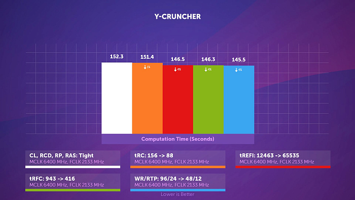 Y-Cruncher снова не демонстрирует реакцию на настройку памяти по сравнению с предыдущими бенчмарками, но даже в нём REFI выделяется.