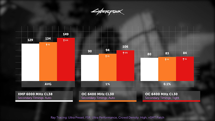 В Киберпанке 16% прирост тоже ощутить можно, а вот 4% что есть, что нет. Конечно, это всё без упора в видеокарту, так что держим в уме.
